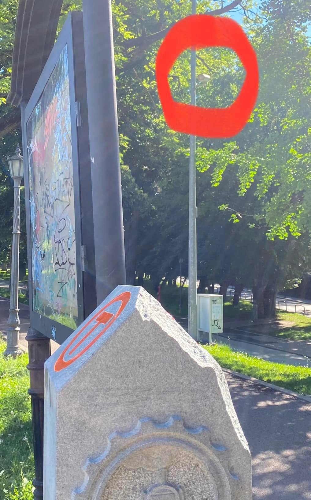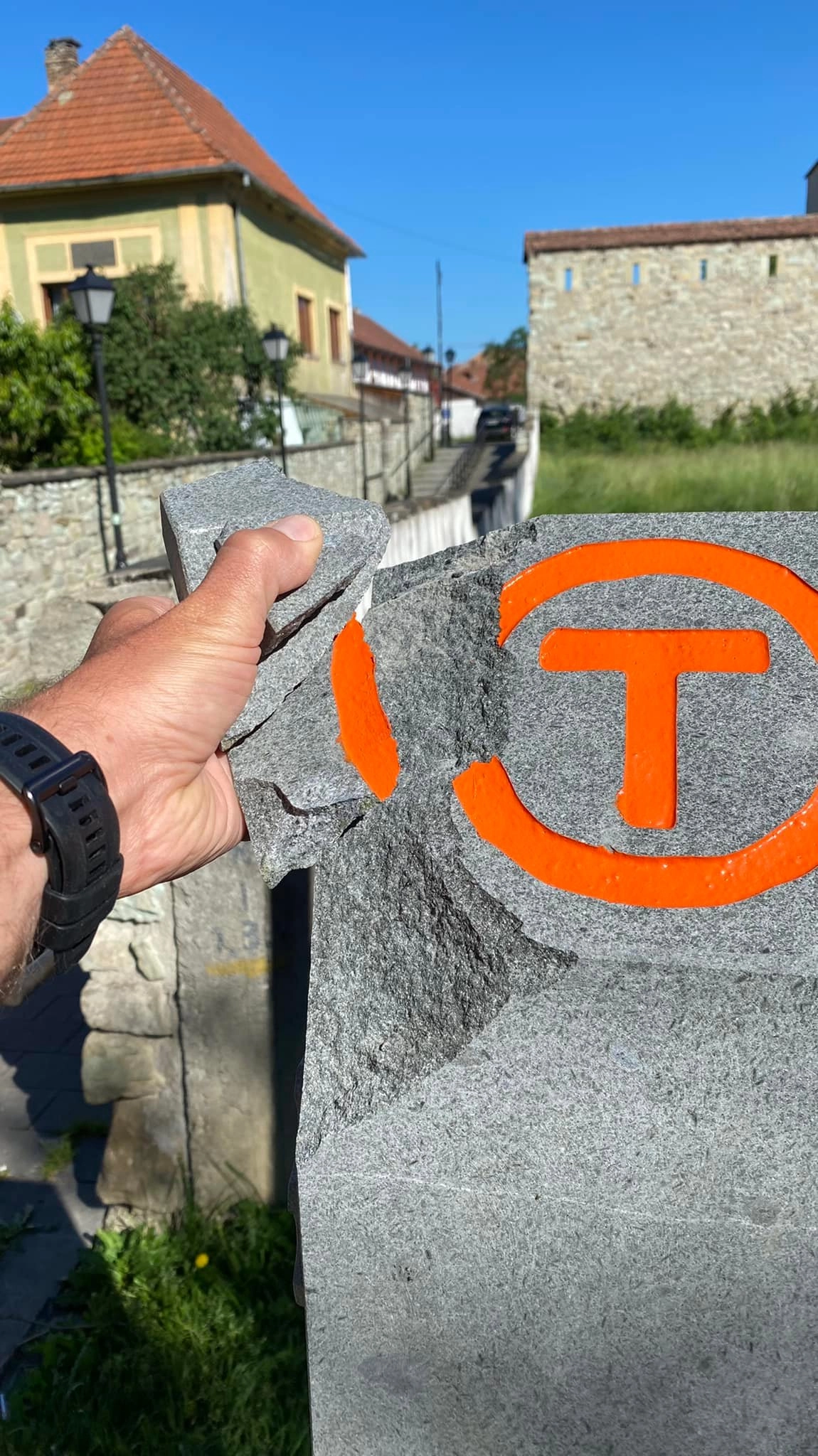 O bornă de pe traseul Via Transilvanica, din municipiul Bistrița, a fost vandalizată. Borna este situată în parc, lângă Turnul Dogarilor.