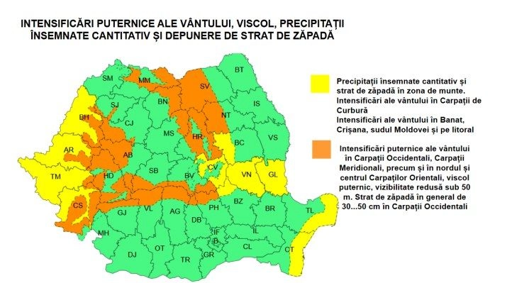 Fenomene vizate: precipitații moderate cantitativ, intensificări ale vântului, viscol la munte, strat de zăpada, polei