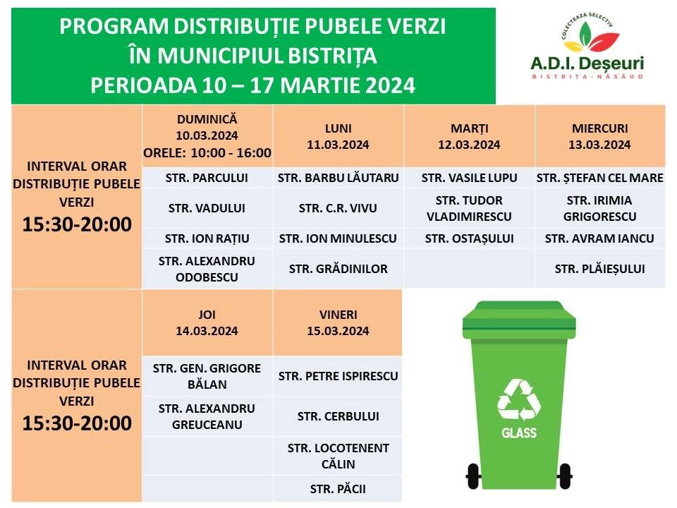 Programul de distribuire a pubelei verzi în perioada 10 – 15 MARTIE 2024 în Municipiul Bistrița, este următorul: