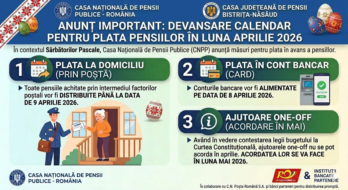 Casa Județeană de Pensii Publice Bistrița-Năsăud a anunțat devansarea plății pensiilor și a indemnizațiilor pentru luna aprilie 2026, în contextul Sărbătorilor Pascale. Măsura are scopul de a asigura beneficiarii că vor primi la timp sumele cuvenite, indiferent de modalitatea de plată aleasă.