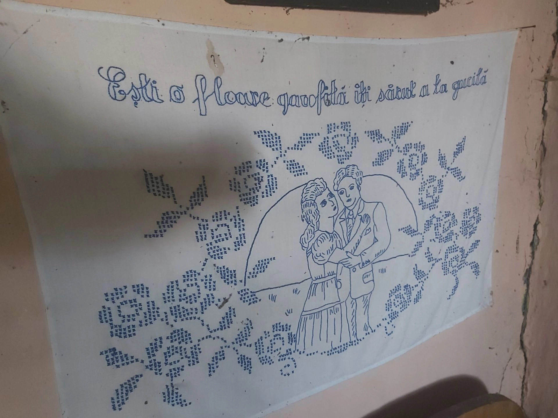 Camera din față pare părăsită de curând. De câteva ore, hai, câteva zile. Timpul pare că a încremenit. Un peretar din anii 60 sau 70 ai secolului trecut pe care stă scris : ”Ești o floare garofiță îți sărut a ta guriță”. Aproape de el, patul desfăcut, acoperit de o plapumă, puțin deranjat, de parcă cel care dormise acolo se ridicase doar de puțină vreme.