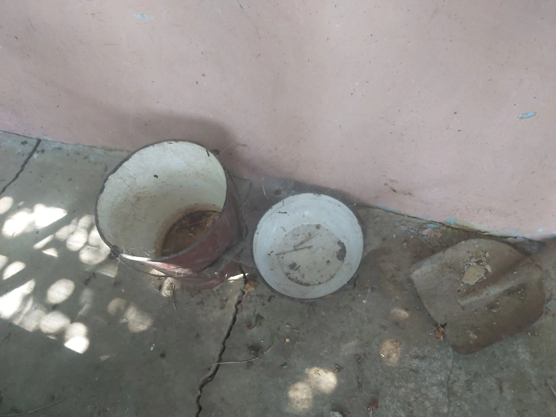În prag o dormeză veche, câteva oale aruncate la întîmplare și dușumele crăpate, murdare. Peste tot cioburi de sticlă, bucăți de haine, o masă șchioapă acoperită de o bucată de mușama pe care sunt desenate câteva fructe: o bucată de pepene roșu, o pară și un măr.