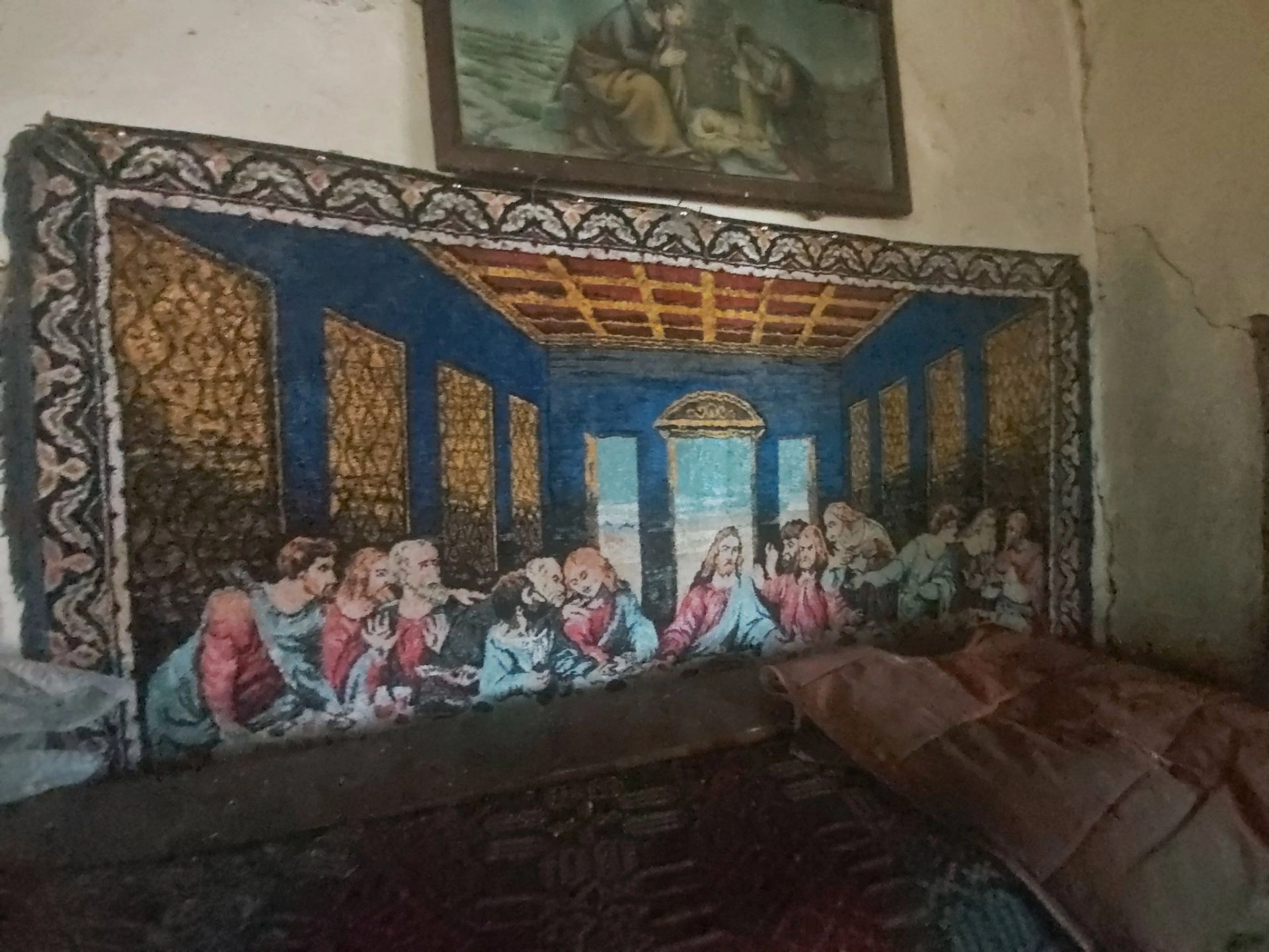 Cealaltă cameră e mai sobră, cumva mai sobră. Pe peretele invadat de crăpăturile ce seamănă cu o pânză de paianjen, pe o cuvertură, Iisus Hristos. Mănâncă. Cina cea de taină. Apostolii nu par deloc veseli. De ce ar fi? Lumea care i-a primit atunci nu a fost pe măsura așteptărilor lor.