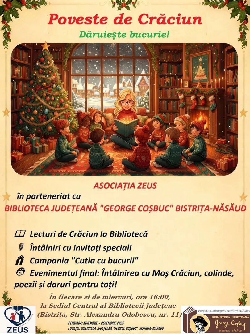 Asociația Zeus, în parteneriat cu Biblioteca Județeană „George Coșbuc” Bistrița-Năsăud, organizează, în perioada noiembrie – decembrie 2025, seria de activități culturale : „Poveste de Crăciun. Dăruiește bucurie !”, constând în: