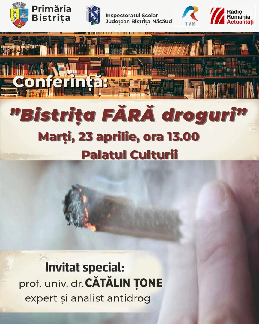 Primăria municipiului Bistrița, în parteneriat cu Inspectoratul Școlar Județean Bistrița-Năsăud, TVR și Radio România Actualități, organizează, astăzi, conferința „Bistrița FĂRĂ droguri”
