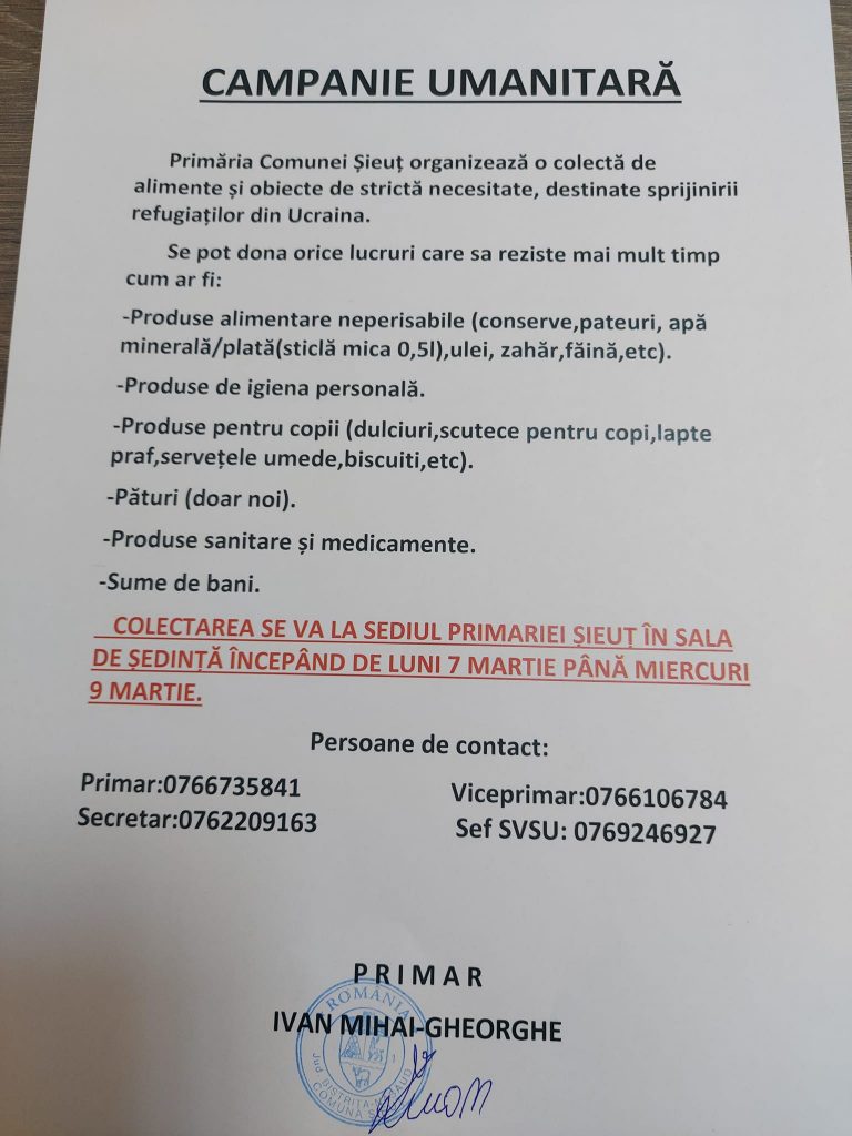 Primăria Șieuț organizează o campanie umanitară pentru refugiații din Ucraina. Colectarea se va face la sediul Primăriei Șieuț, începând de luni, 7 martie.