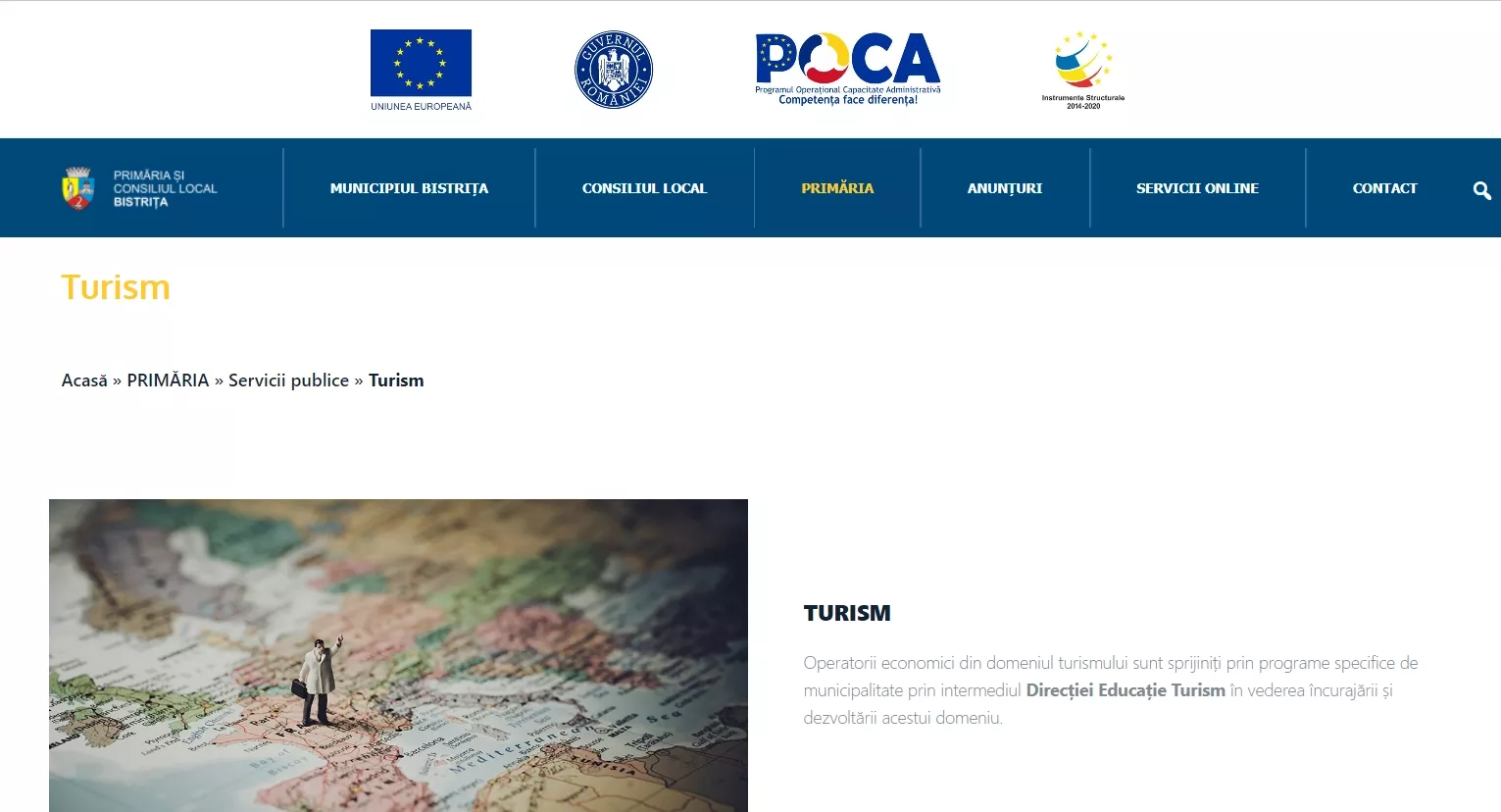 Am încercat și la primăria municipiului Bistrița. Cred că toate instituțiile din județ s-au înțeles între ele să ascundă tot ce înseamnă turism local, altfel nu înțeleg cum e posibil să nu găsim nici aici nimic. La primăria Bistrița am găsit secțiunea turism unde scrie ceva de operatorii economici sprijiniți..în fine, altă bătaie de joc, un wordpress, de astă dată făcut din bani europeni.