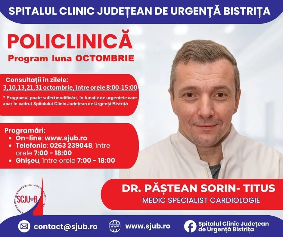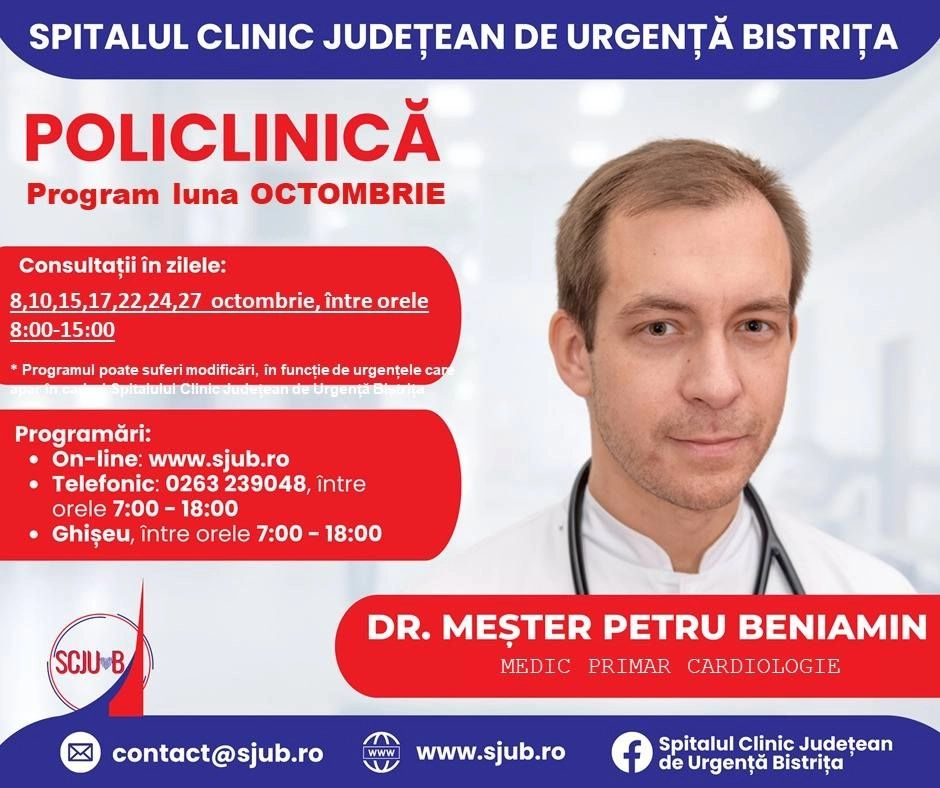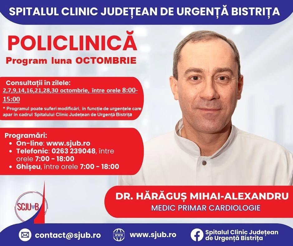 Programări disponibile la specialitatea Cardiologie din Policlinica Bistrița, pentru luna octombrie