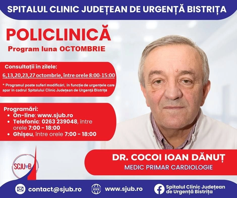Programări disponibile la specialitatea Cardiologie din Policlinica Bistrița, pentru octombrie