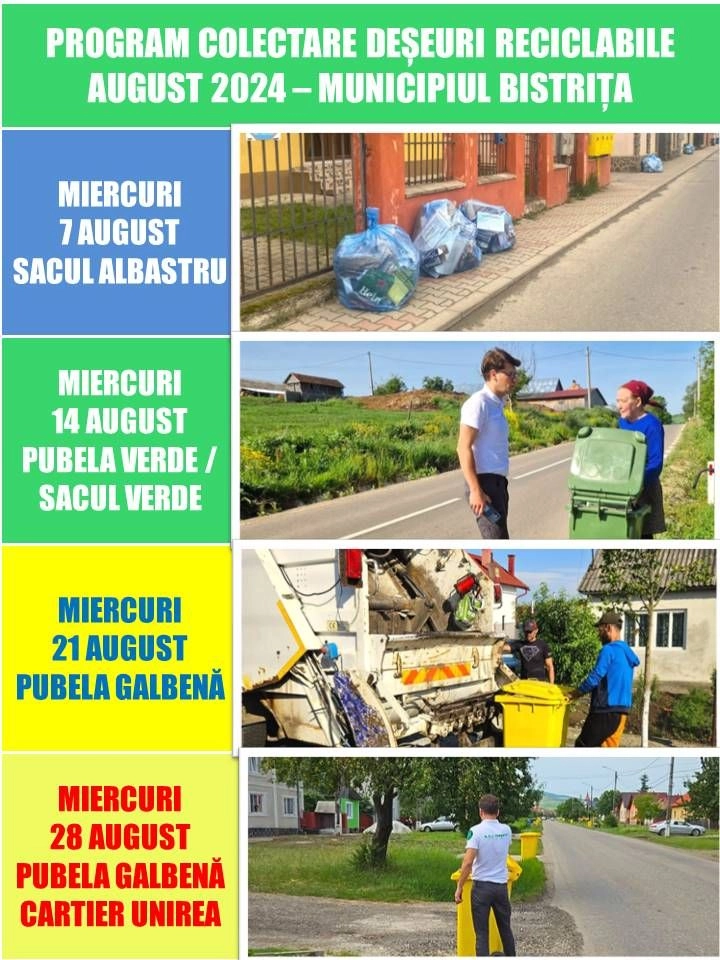 În luna AUGUST 2024, programul de colectare a deșeurilor reciclabile în municipiul Bistrița este: