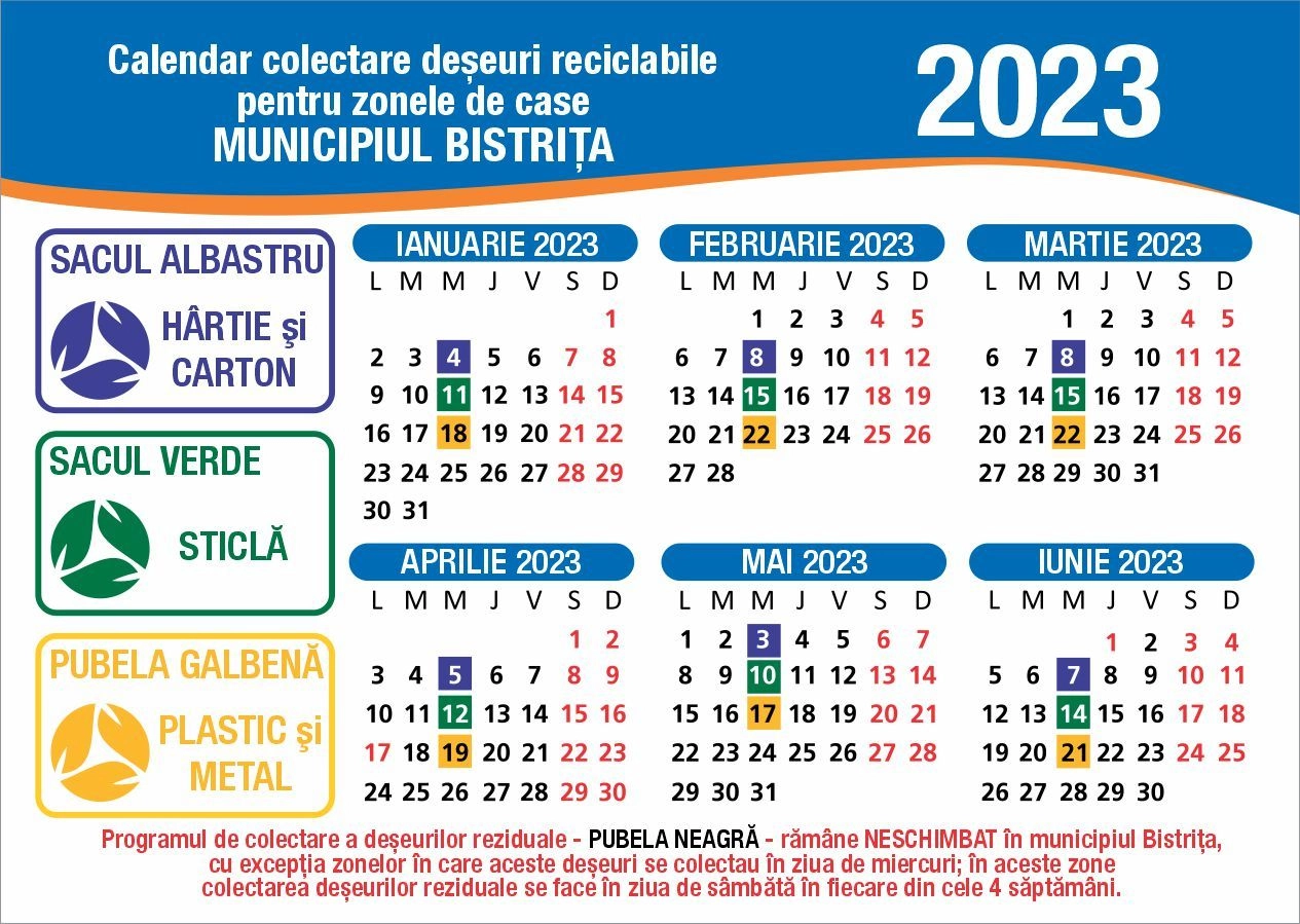 În municipiul Bistrița și localitățile componente, programul de colectare a deșeurilor reziduale – adică pubela neagră – rămâne NESCHIMBAT, cu excepția zonelor în care colectarea acestor deșeuri se realiza în ziua de miercuri. Pentru aceste zone, ziua de colectare a pubelei negre este ziua de SÂMBĂTĂ.