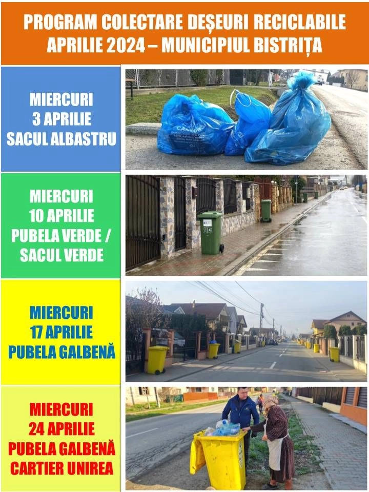 Programul de colectare a deșeurilor reciclabile din municipiul Bistrița și localitățile componente pentru luna aprilie 2024