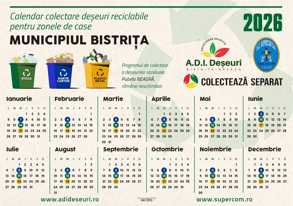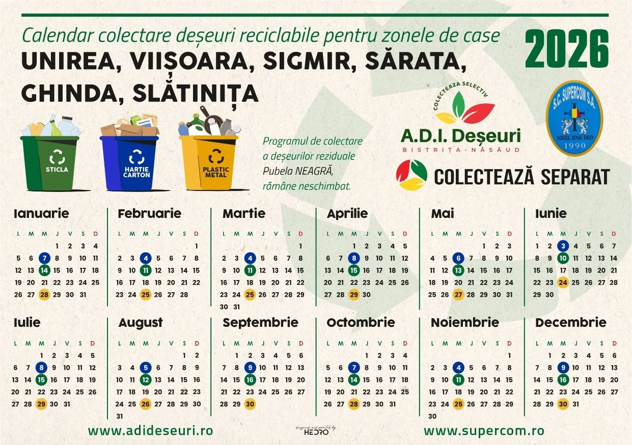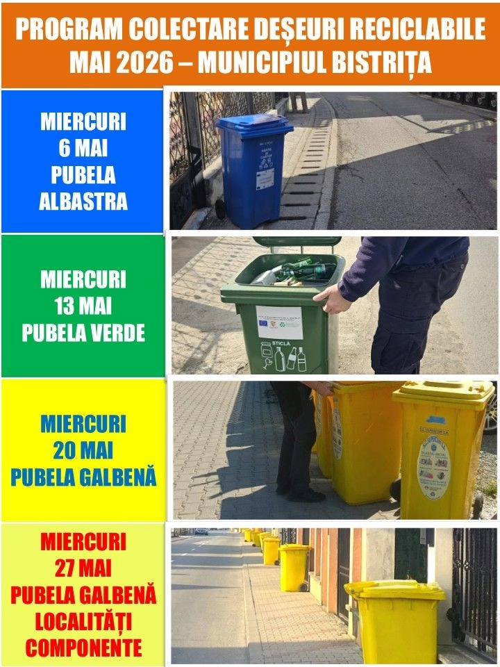 În luna MAI 2026, programul de colectare a deșeurilor reciclabile în Municipiul Bistrița și în localitățile componente – Unirea, Viișoara, Sărata, Sigmir, Ghinda și Slătinița, începe de săptămâna viitoare – de MIERCURI, 6 MAI! Implică-te în colectarea selectivă a deșeurilor reciclabile încă din gospodăria ta!
