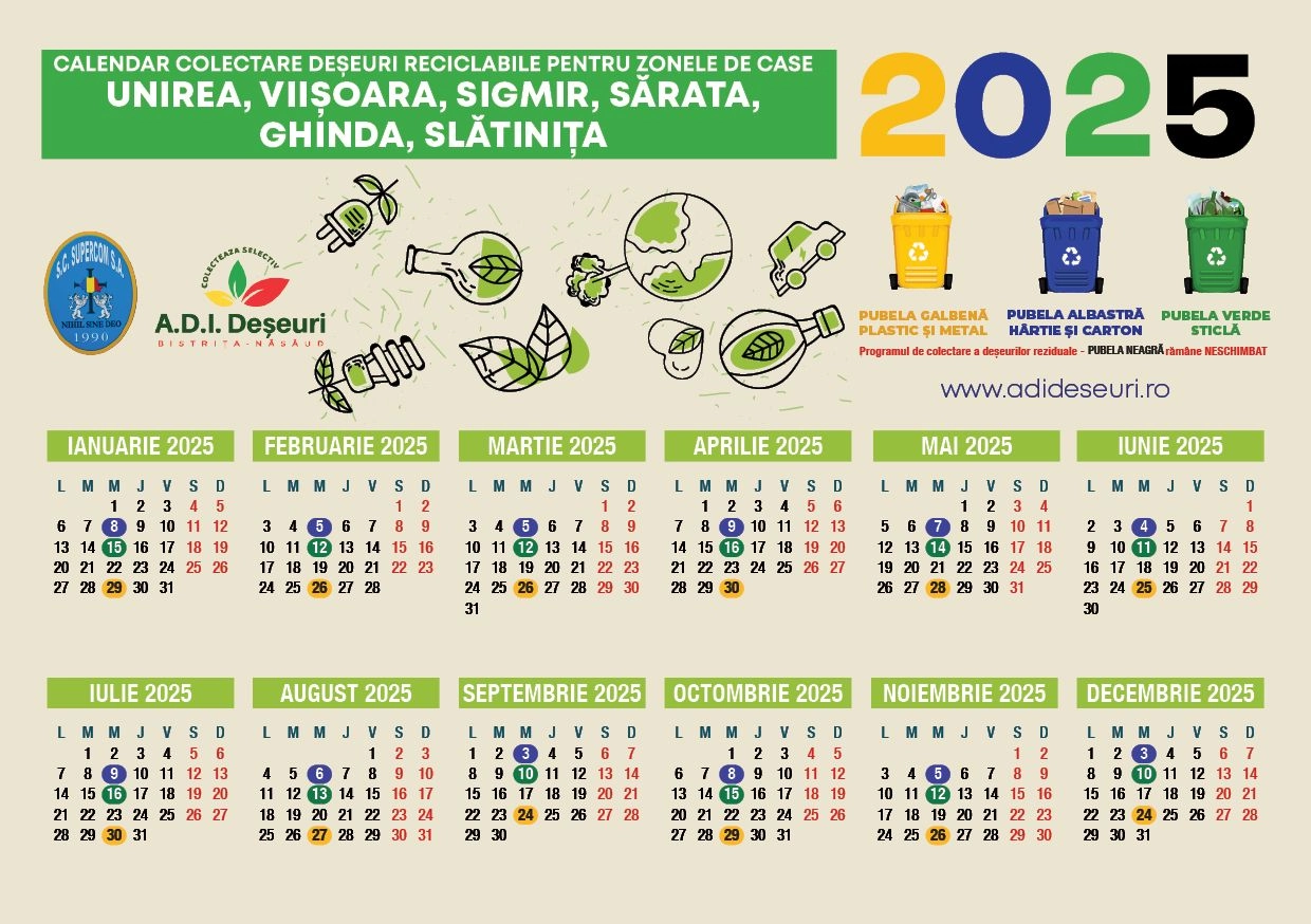 Intră pe www.adideseuribn.ro sau sună la tel. 0263.944 – Dispecerat Supercom pentru a afla calendarul de colectare a deșeurilor în fiecare localitate din județul Bistrița-Năsăud.