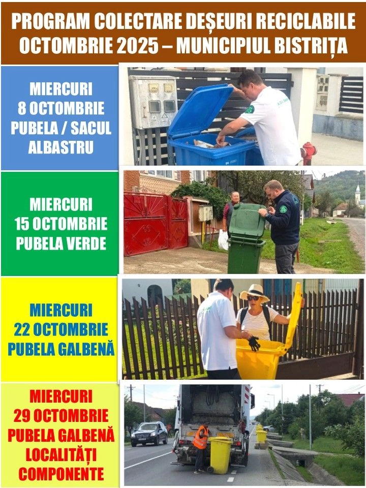 Programul de colectare a deșeurilor reciclabile în luna OCTOMBRIE 2025 pentru Municipiul Bistrița și localitățile componente începe din prima săptămână întreagă a lunii.
