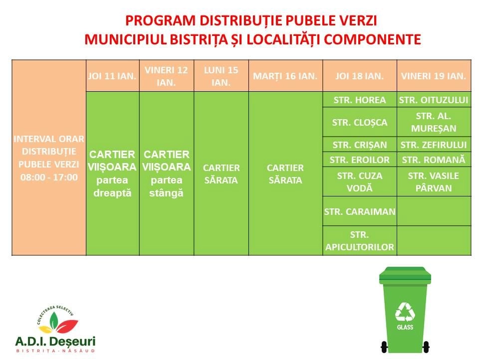 În orașele Beclean, Năsăud, Sîngeorz-Băi și zona RURALĂ, distribuția pubelelor verzi a început în această săptămână și este coordonată de primăriile din aceste localități. Recipientele de colectare a deșeurilor reciclabile din sticlă se distribuie pe baza buletinului de identitate și semnătură.