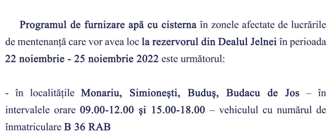 Programul de furnizare a apei cu cisterna, în zonele afectate de lucrările de pe Dealul Jelnei