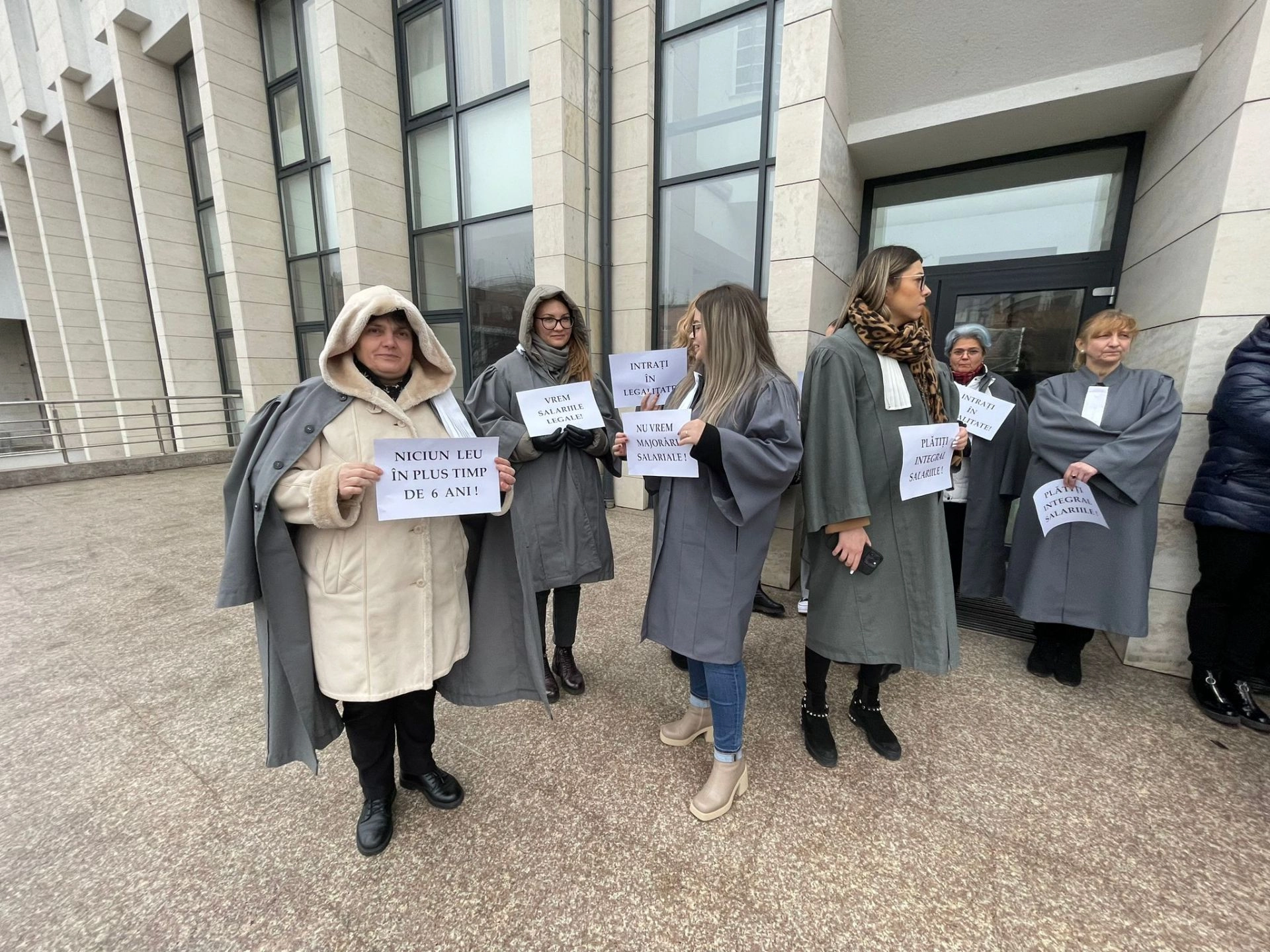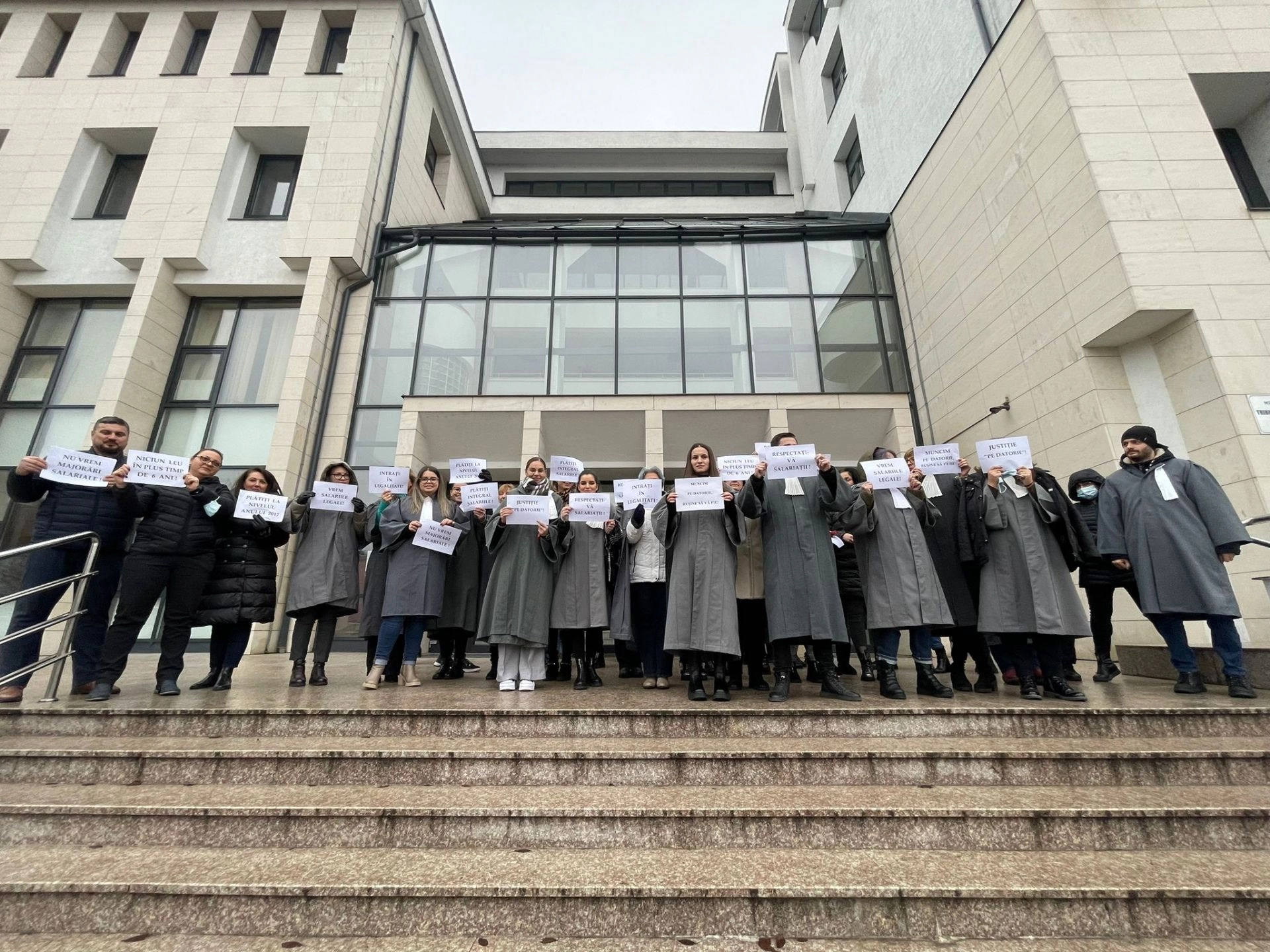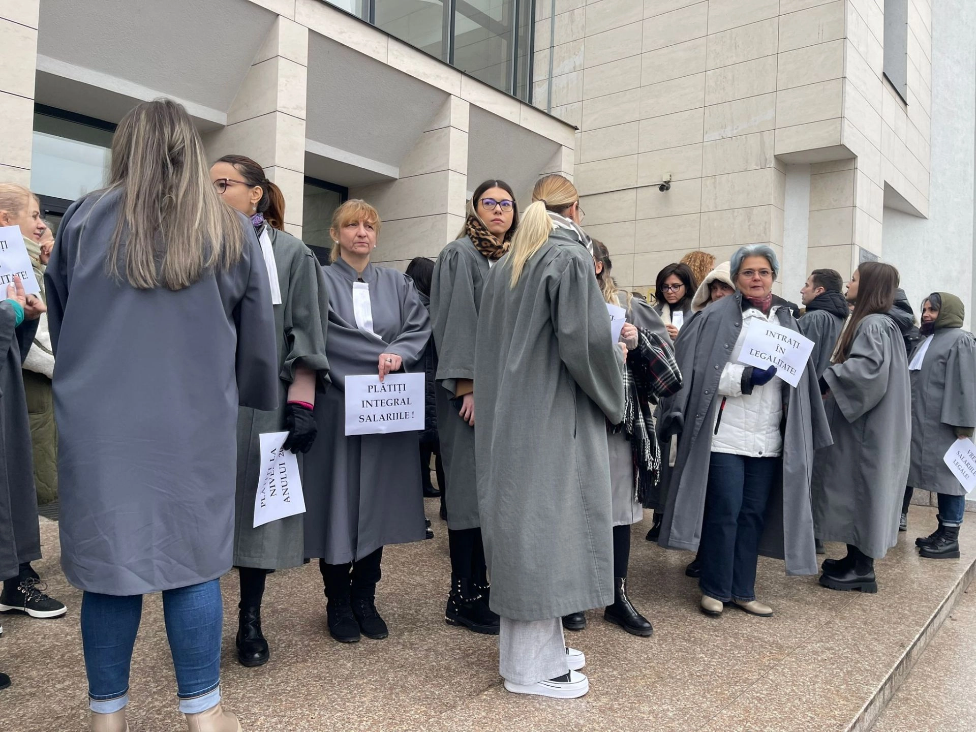 "Niciun leu în plus, timp de 6 ani", "Vrem salariile legale", "Intraţi în legalitate", sunt câteva dintre mesajele transmise de angajaţii de grefierii şi de personalul auxiliar de la Tribunalul Bistriţa-Năsăud.