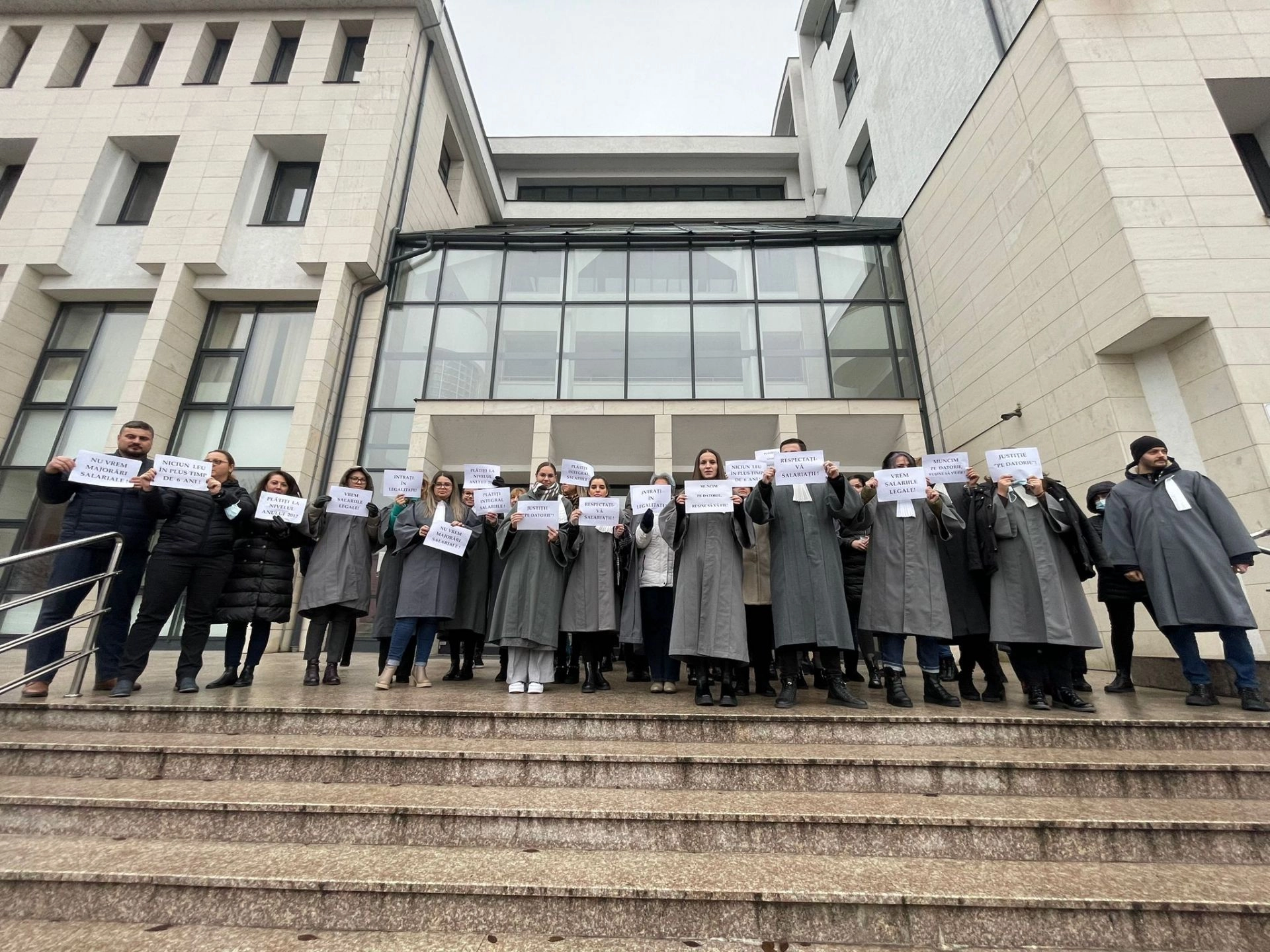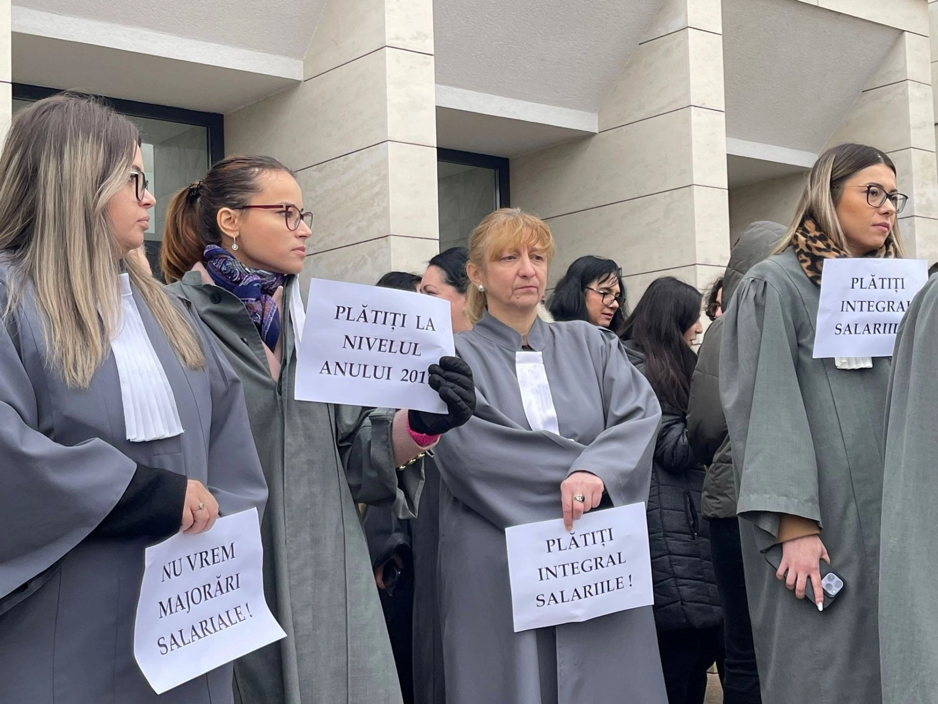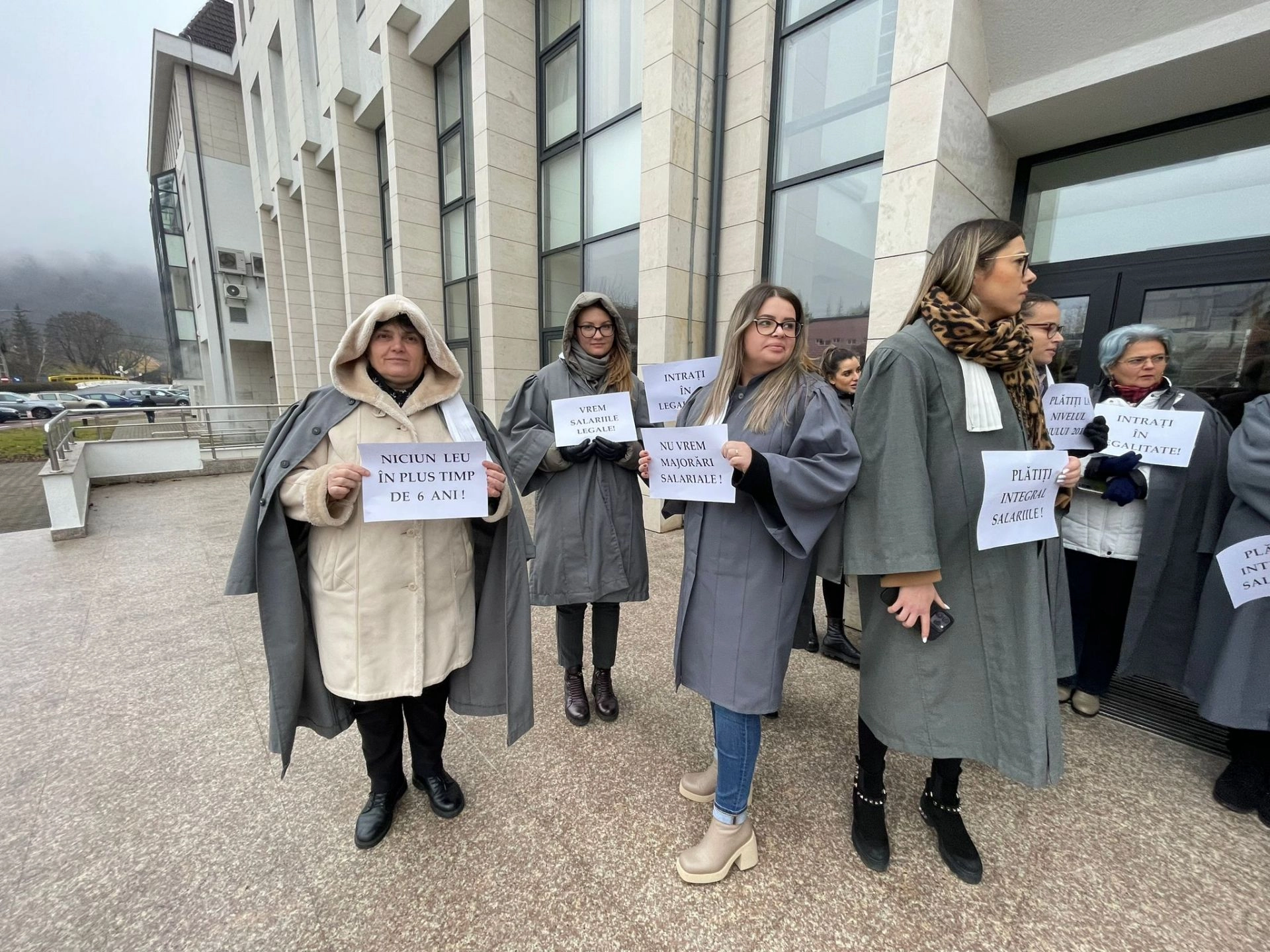 "Niciun leu în plus, timp de 6 ani", "Vrem salariile legale", "Intraţi în legalitate", sunt câteva dintre mesajele transmise de angajaţii de grefierii şi de personalul auxiliar de la Tribunalul Bistriţa-Năsăud.