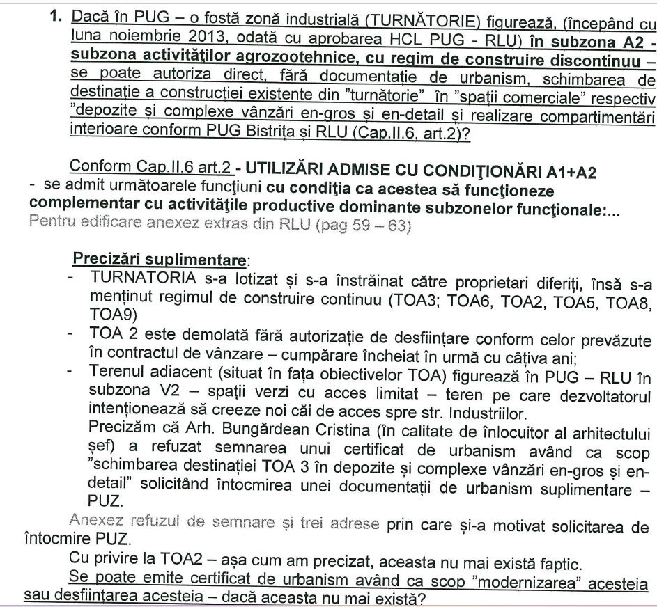 „Vă rugăm să ne comunicați care este interpretarea corectă, legală și în interesul general al colectivității în următoarele situații: Dacă în PUG – o fostă zonă industrial (turnătorie) figurează (începând cu luna noiembrie 2013, odată cu aprobarea HCL PUG –RLU) în subzone A2 – subzone activităților agrozootehnice, cu regim de construire discontinuu – se poate autoriza direct, fără documentație de urbanism, schimbarea de destinație a construcției existente din «turnătorie» în «Spații comerciale» respective «depozite și complexe vânzări en-gros și en-detail și realizarea compartimentări interioare conform PUG Bistrița și RLU?», întreabă Floare Gaftone în adresa remisă ministerului. (vezi facsimil 2) . Ce treabă o avea Ministerul Dezvoltării, rămâne să aflăm în viitorul apropiat.