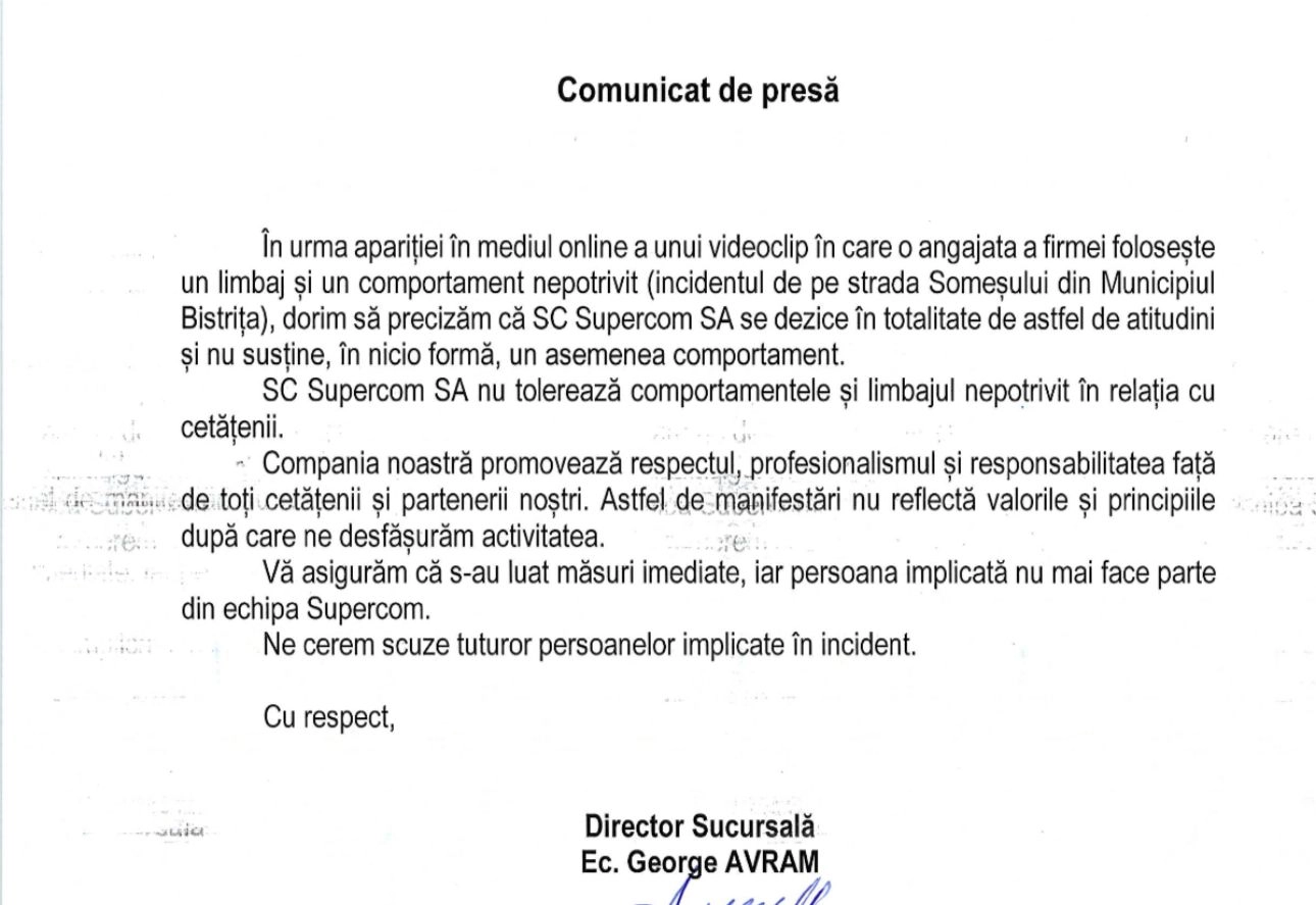 Un scandal a avut loc în Bistrița, pe stradă, unde o angajată a companiei Supercom a înjurat un cetățean.