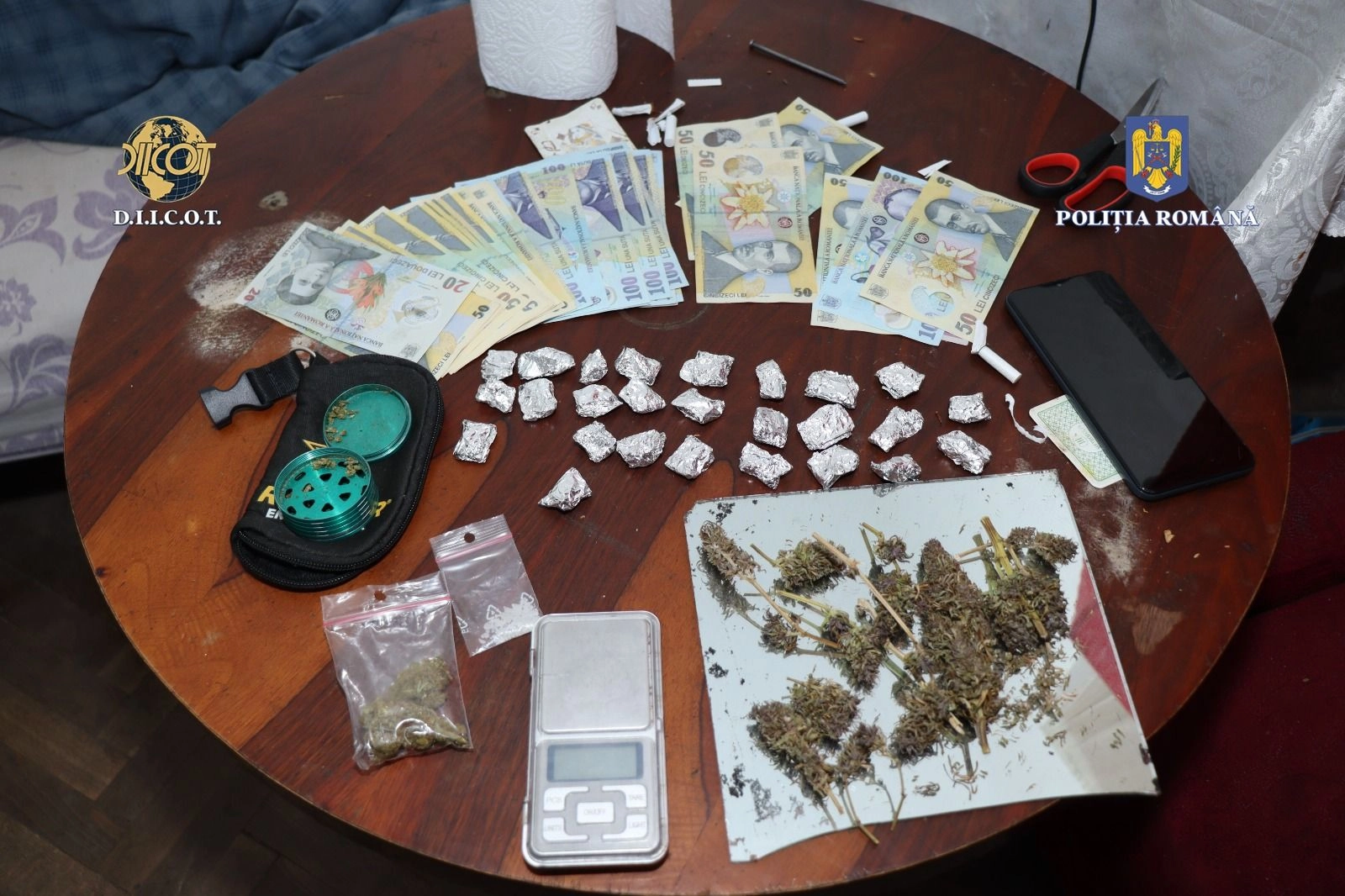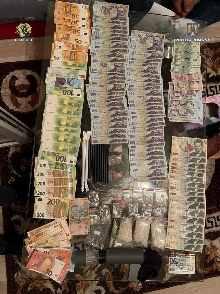 În urma perchezițiilor, polițiștii au descoperit și ridicat, în vederea continuării cercetărilor, 4 pistoale neletale, dintre care 2 supuse autorizării, un arc, aproximativ 70 de grame de 3-CMC, 673 de plicuri ziplock nefolosite, 24 de grame de substanță vegetală, susceptibilă a fi cannabis, 4 cântare de mare precizie, 3 grindere, 33 de telefoane mobile, 2 laptopuri, 9 ceasuri, precum și 11.715 lei, 4.240 de euro, 100 de dolari și 100 de franci elvețieni.