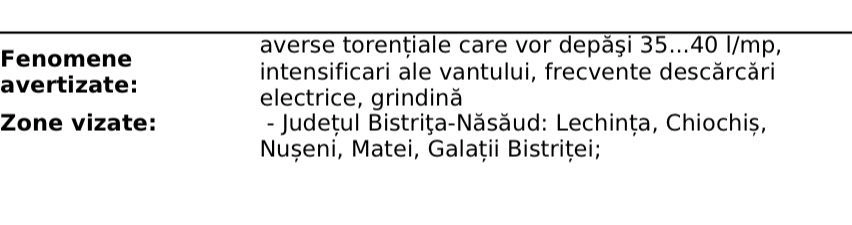 ISU Bistrița a trimis mesaj prin sistemul Ro-Alert, conform avertizării ANM COD PORTOCALIU - măsuri de autoprotectie, pentru următoarele localități:
