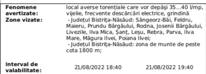 ISU Bistrita a trimis mesaj prin sistemul Ro-Alert, conform avertizării ANM COD PORTOCALIU - măsuri de autoprotectie, pentru următoarele localități:
