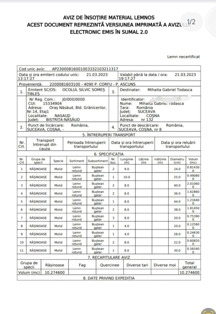 Tot conform altor documente eliberate tot de Ocolul Silvic Someș-Tibleș, în data de 20 03 2023 s-a mai efectuat un transport de material lemnos tot din UP 1 Nimigea partida 4090 P. Corfu P.