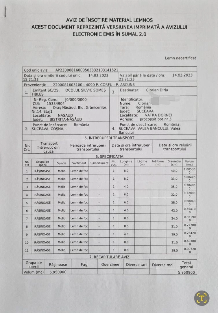 Potrivit lui Gavrilă Mureșianu, transportul a ajuns tot la cetățeni din județul Suceava, respective comuna Poiana Stampei: "E vorba de Ciforescu Dumitru din Poiana Stampei nr 39 jud Suceava, cu un volum de 5.193 MC buștean gater molid AP23000816000503332103200812, Iordache Mihai Gavril din Poiana Stampei nr 110 Suceava cu un volum de 9.959 MC buștean gater molid , AP 23000816000503332103200807, Ursu Mihai din Poiana Stampei nr 71 Suceava, cu un volum de 10.065 MC buștean gater molid AP23000816000503332103200802 și Chiriluș Silviu di Poiana Stampei nr 240 Suceava, cu un volum de 9.998 MC buștean gater molid AP23000816000503332103200755, transportul fiind efectuat cu auto numărul SV 06 VTX la ora 08:12”, mai arată Mureșianu. De asemenea, în data de 21 03 2023 tot din partida 4090 a fost eliberat un aviz pe material lemnos, buștean gater de esență molid pe numele Todască Gabriel Mihăiță din localitatea Cosna, nr 132, județul Suceava, cu un volum de 10.274 MC buștean gater conform AP23000816001003332103211317”.
