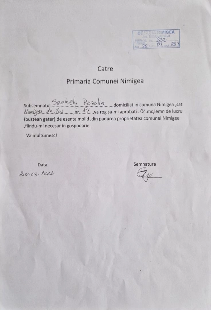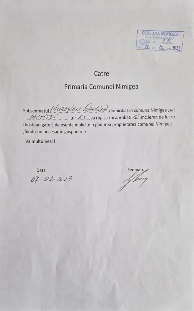 În aceiași ordine de idei, interlocutorul nostru subliniază următoarele: ” Primarul Mircea Gavrilă, știe despre vânzarea acestui material lemnos, de destinația lui și cred că beneficiază financiar adică primeste cotă, parte (%) de pe urma vânzării acestui lemn, altfel nu-mi explic neaprobarea cererilor pentru material de constructii, depuse la primăria Nimigea în data de 20. 02 .2023, în condițiile în care au fost solicitări din partea unor cetățeni ai comunei Nimigea, care sunt prioritari în achiziția de lemn de construcții și de foc, fiind vorba despre pădurea proprietate comunei Nimigea, față de persoanele care nu sunt cetățeni ai comunei Nimigea”