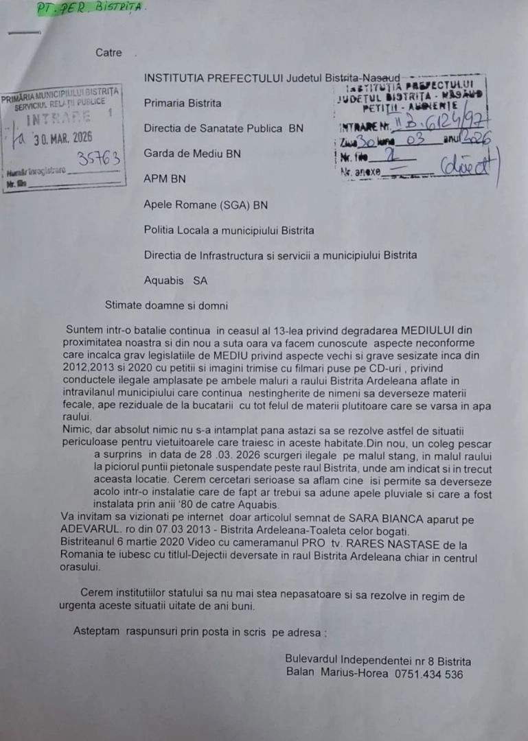 Pentru a închide gura cârcotașilor și pentru a arăta că lupta pentru râu a trecut la un alt nivel, am decis să acționăm unit: jurnaliști, pescari și activiști de mediu. Nu mai sunt doar postări pe Facebook, ci documente oficiale care ard pe birourile șefilor din instituții.Priviți fotografia: sunt cinci ștampile oficiale (Prefectură, Primărie, Gardă de Mediu, APM și SGA) care confirmă că am demarat toate procedurile legale. Am pus statul în fața faptului împlinit. De azi, orice minut de tăcere din partea lor se numește complicitate.Dar nesimțirea nu are limite. În timp ce noi depuneam actele, echipa noastră de teren – pescari și activiști care au pus umărul la acest demers – a mai găsit un focar de infecție: o deversare masivă care „vomită” dejecții chiar acum la Podul Jelnei!Ce am cerut oficial, împreună:1.Identificarea poluatorilor de la Podul Berăriei și Podul Jelnei. Vrem nume, nu comunicate sterile!2.Sigilii de plumb IMEDIATE. Nu mai acceptăm „monitorizări” în timp ce râul moare sub ochii noștri de 14 ani.