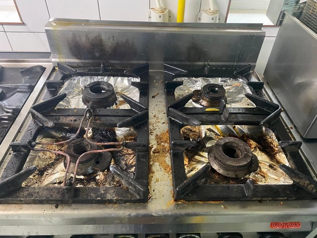 2. La data și ora efectuării controlului în bucătăria unității erau utilizate echipamente și ustensile neconforme: mașină de gătit, tăvițe și tigăi cu depuneri de grăsime arsă, cuțite cu mâner din lemn, friptioze (friteuse) cu uleiul ars și coșuri de gunoi pentru resturi alimentare fără capac. Recipientele multor produse folosite la preparare erau larg deschise, igiena mesei de gătit era precară.