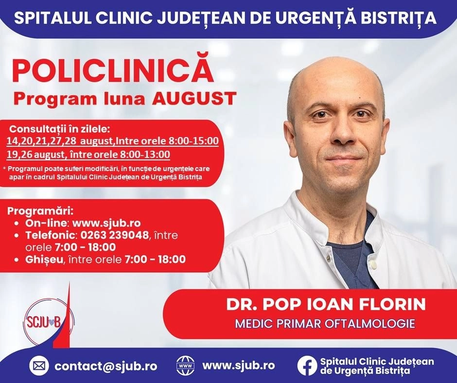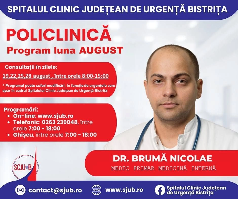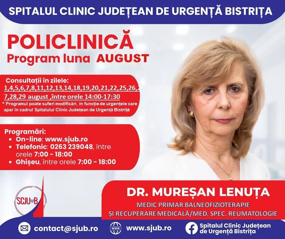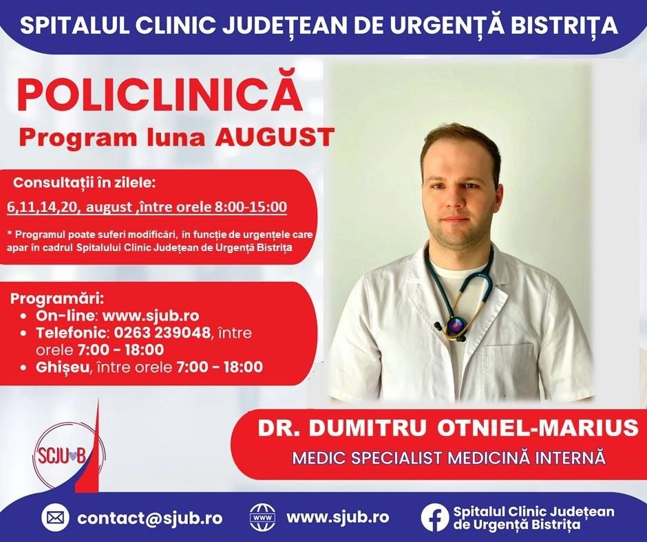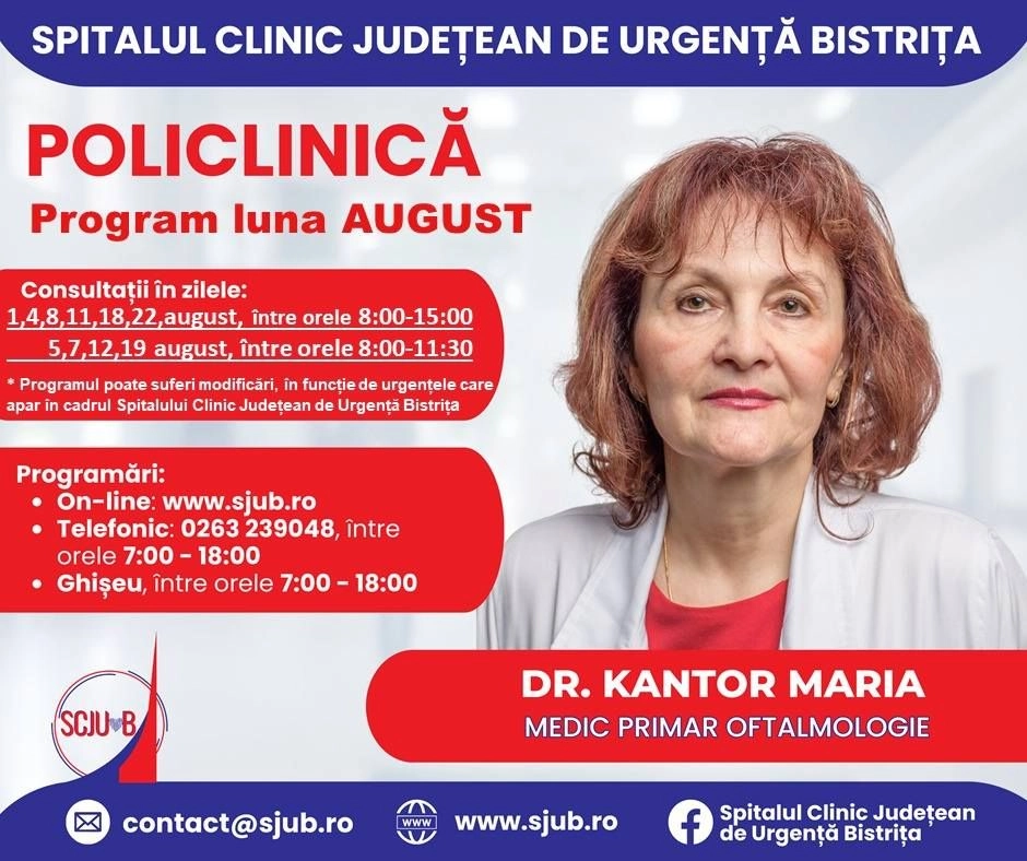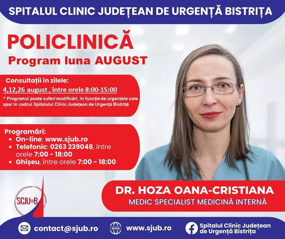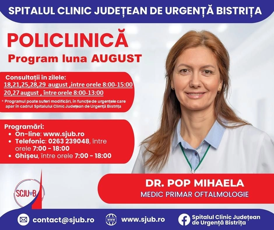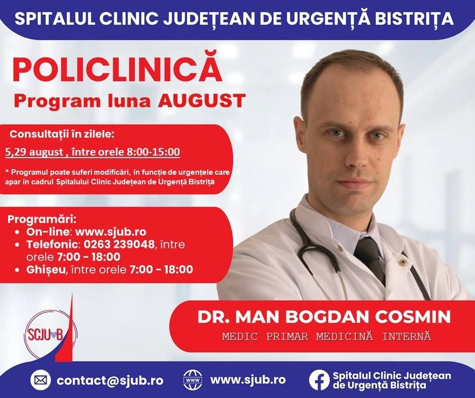 Începând de mâine, 24 iulie, se vor putea face programări pentru luna august la mai multe specialități medicale din Policlinica Bistrița.
