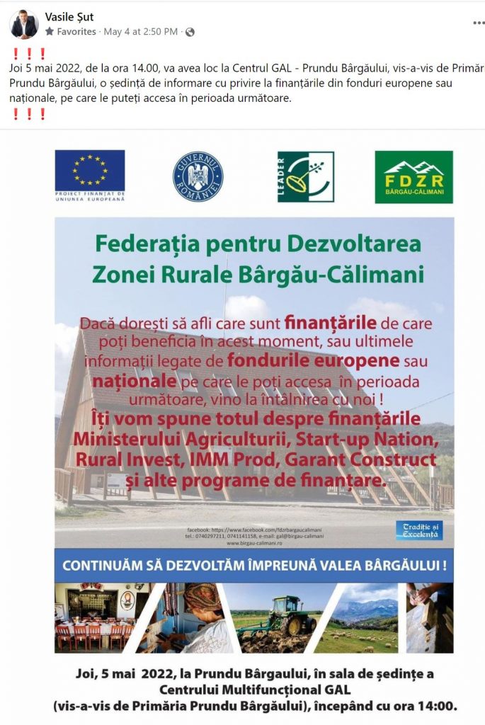 Joi 5 mai 2022, de la ora 14.00, va avea loc la Centrul GAL – Prundu Bârgăului, vis-a-vis de Primăria Prundu Bârgăului, o ședință de informare cu privire la finanțările din fonduri europene sau naționale, pe care le puteți accesa în perioada următoare, a anunțat primarul comunei Tiha Bârgăului, Vasile Șut.