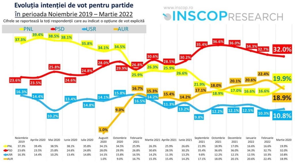 Un sondaj realizat de INSCOP Research ne arată faptul că AUR este principalul pierzător al războiului din Ucraina, asta probabil și din cauza acuzațiilor că ar fi apropiați de Rusia, acuzații negate de liderii AUR. În schimb, PNL câștigă teren, iar implicarea președintelui Klaus Iohannis se simte și în sondaje. Datele au fost culese prin interviuri telefonice în perioada 2-7 martie 2022 pe un eșantion de 1077 de repondenți.