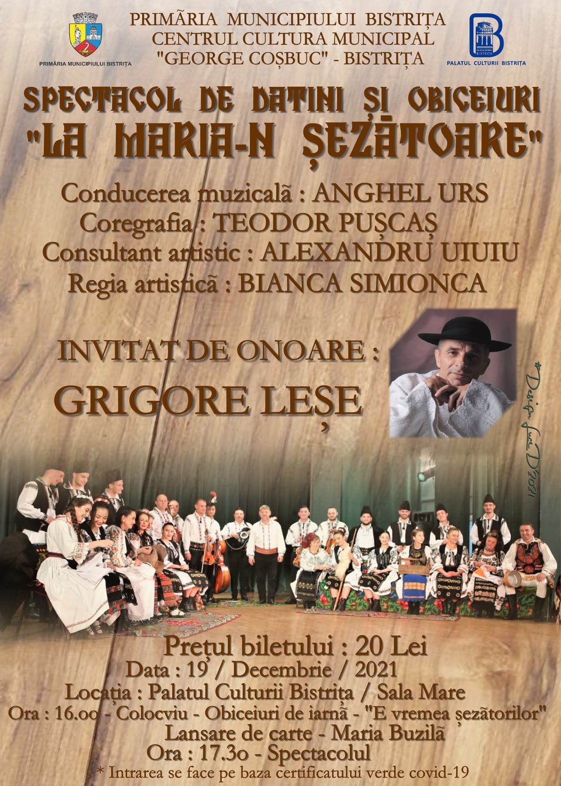 Primăria Municipiului Bistrița și Palatul Culturii Bistrița, vă invită să participați la un spectacol în premieră, intitulat „La Maria-n Șezătoare”. Spectacolul de datini și obiceiuri „La Maria-n Șezătoare” va avea loc, duminică, 19 decembrie 2021, la Palatul Culturii Bistrița, începând cu ora 17:30. În cadrul acestui eveniment, Ansamblul Profesionist „Cununa de pe Someș”, va […]