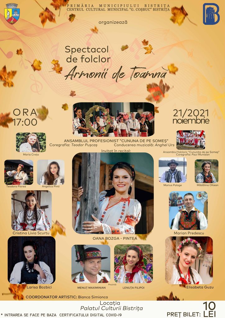 În data de 21 noiembrie 2021, va avea loc un spectacol de folclor ,,Armonii de Toamnă” la Palatul Culturii Bistrița. Spectacolul va avea loc de la ora 17:00 și prețul unui bilet este de 10 lei.