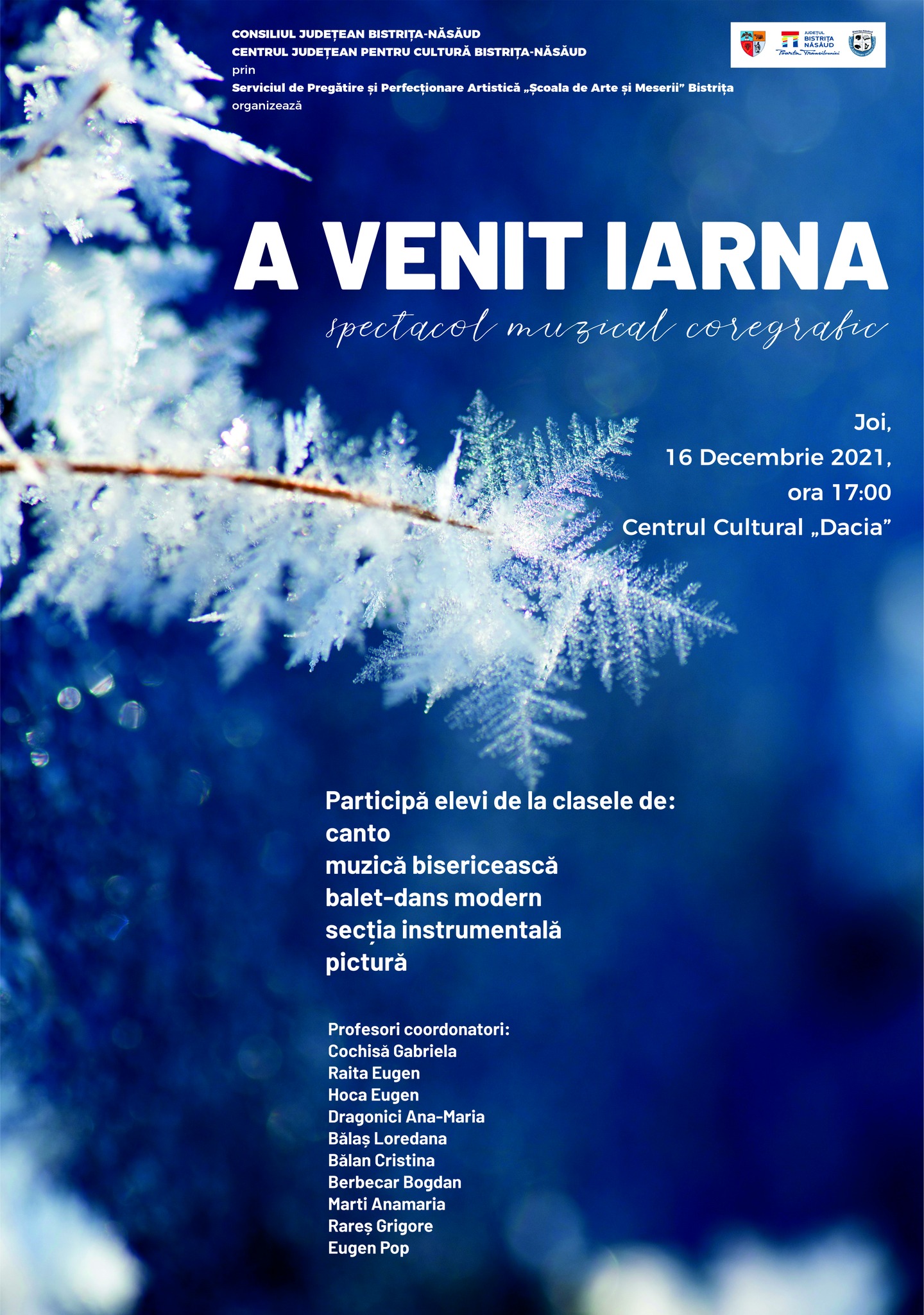 Spectacol muzical-coregrafic – A VENIT IARNA Școala de Arte și Meserii Bistrița Joi, 16 decembrie 2021, ora 17:00 Centrul Cultural „Dacia” Bistrița