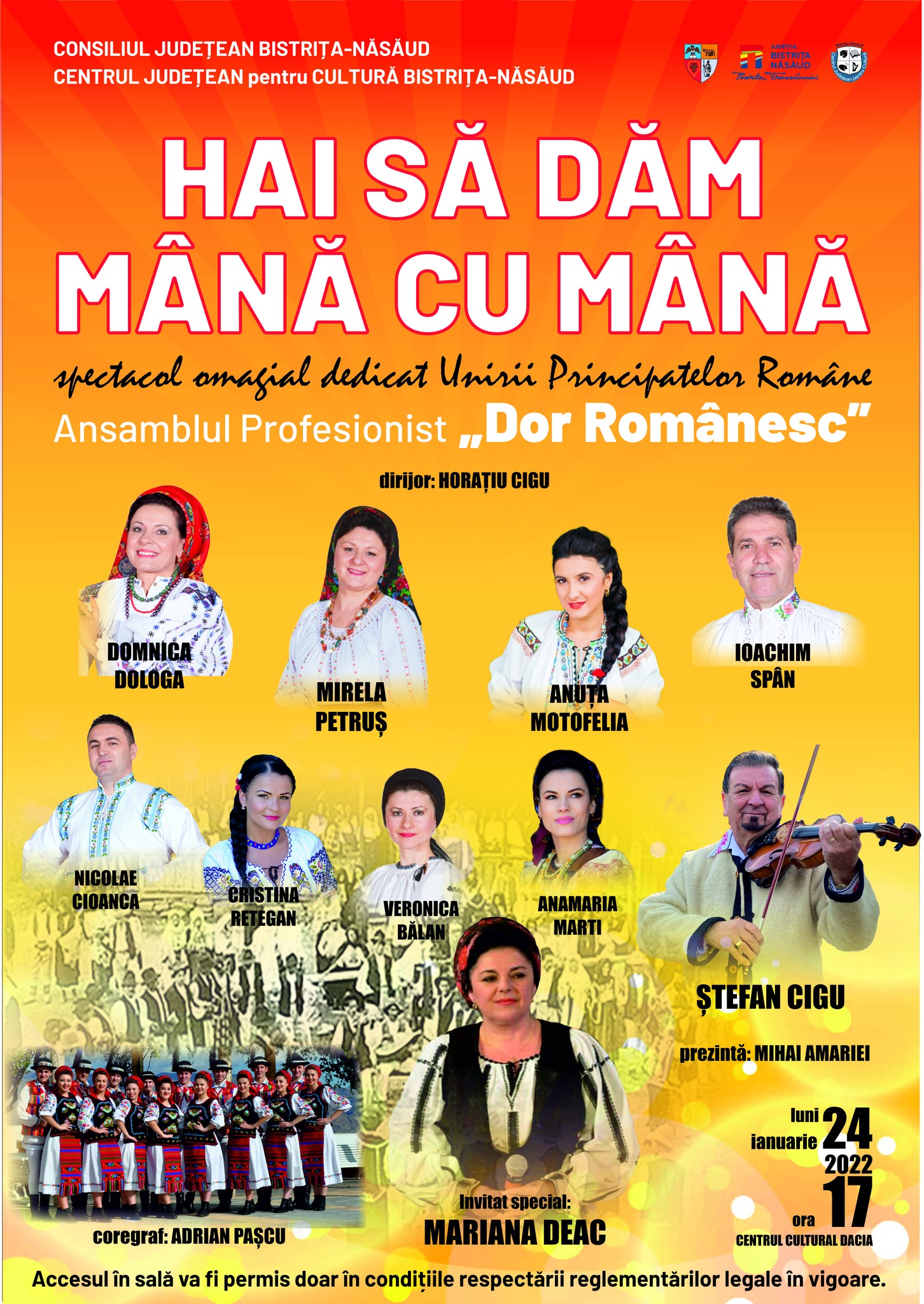 CONSILIUL JUDEȚEAN BISTRIȚA-NĂSĂUD CENTRUL JUDEȚEAN pentru CULTURĂ BISTRIȚA-NĂSĂUD vă invită la Spectacol omagial dedicat Unirii Principatelor Române „HAI SĂ DĂM MÂNĂ CU MÂNĂ” Ansamblul Profesionist „Dor Românesc” participă soliștii: Domnica Dologa Mirela Petruș Anuța Motofelia Ioachim Spân Nicolae Cioancă Cristina Retegan Veronica Bălan Anamaria Marti Ștefan Cigu dirijor: Horațiu Cigu coregrafia: Adrian Pașcu invitat special: […]