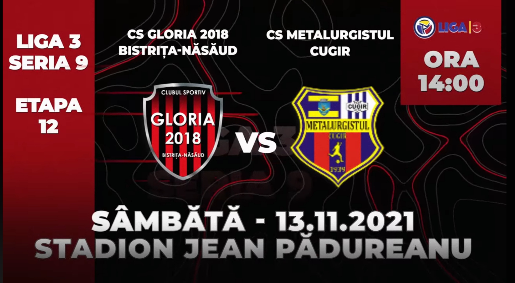 Sâmbătă, de la ora 14.00, echipa CS Gloria 2018 va juca împotriva echipei Metalurgistul Cugir, la Bistrița Echipa Metalurgistul Cugir ocupă locul...