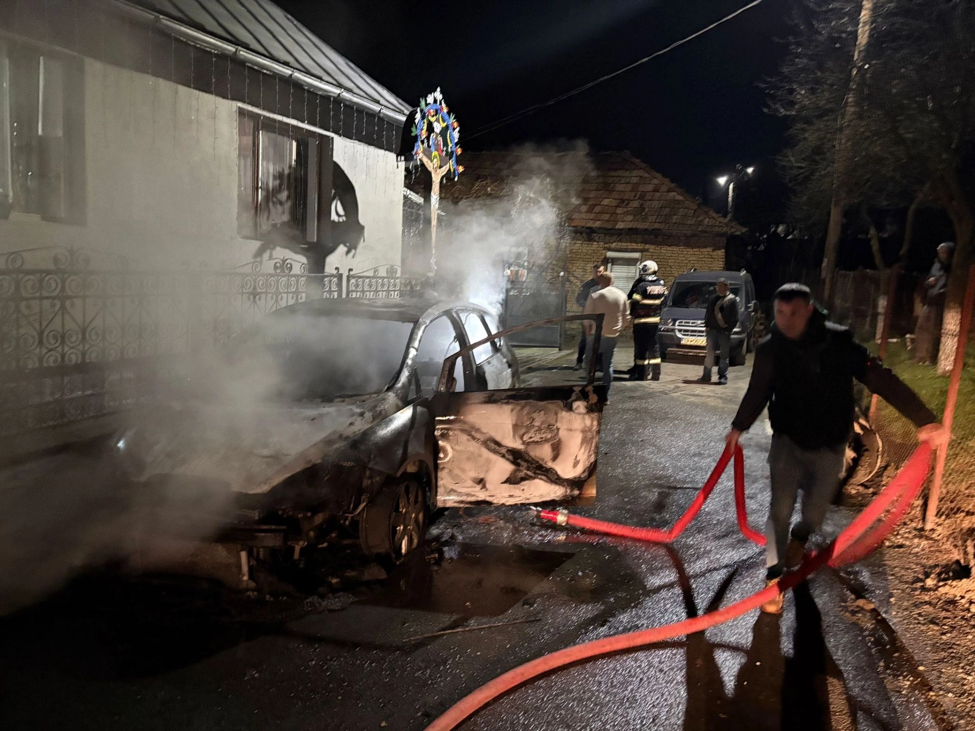 Un autoturism a fost mistuit de flăcări în cursul nopții de sâmbătă spre duminică, în jurul orei 02.30, în localitatea Căianu Mic.