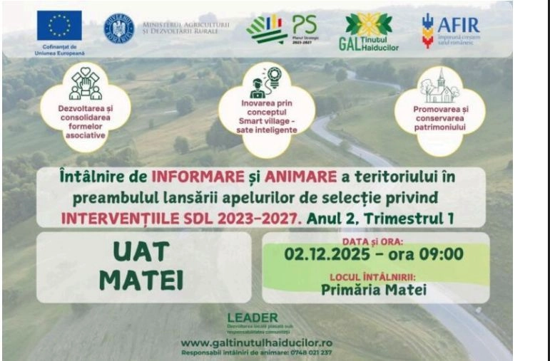 29.11.2025Întâlnire GAL Ținutul Haiducilor la Matei: oportunități de finanțare pentru dezvoltarea comunităților rurale