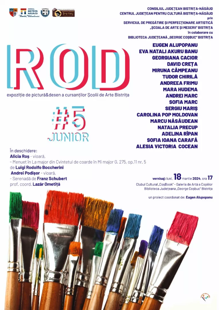 16.03.2024„ROD #5 JUNIOR” – Expoziție de pictură & desen a cursanților Școlii de Arte Bistrița: luni, 18 martie la Biblioteca Județeană