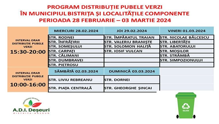 26.02.2024Programul de distribuire a pubelei verzi în perioada 28 februarie – 03 martie 2024 în Municipiul Bistrița