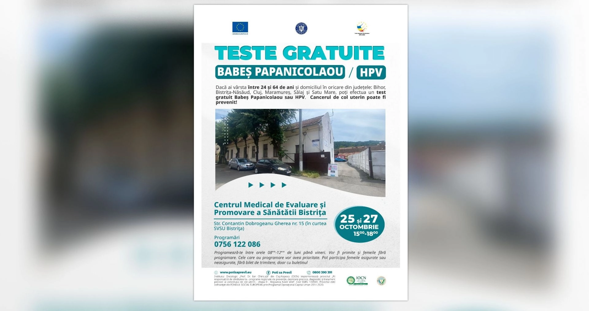 24.10.2023Un test de 5 minute pentru 5 ani de liniște. Teste gratuite Babeș-Papanicolaou și HPV în Bistriţa, la Centrul Medical de Evaluare și Promovare a Sănătății