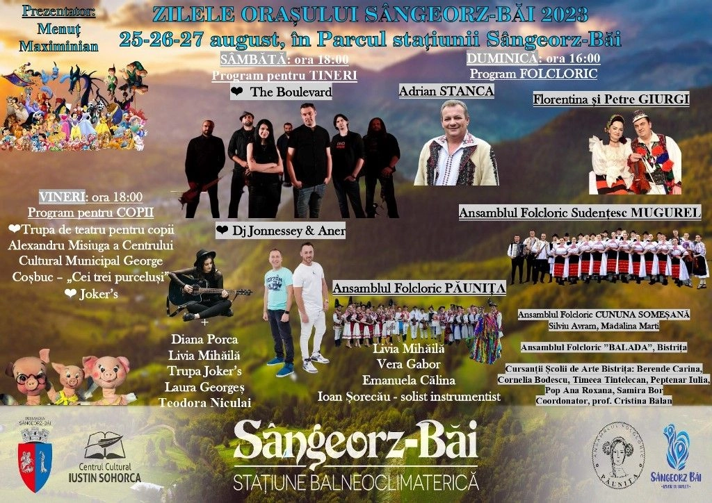 Orașul Sângeorz-Băi va fi în sărbătoare în perioada 25 -27 august! Cu prilejul Zilelor orașului, Primăria Sângeorz-Băi, Consiliul Local și Centru...