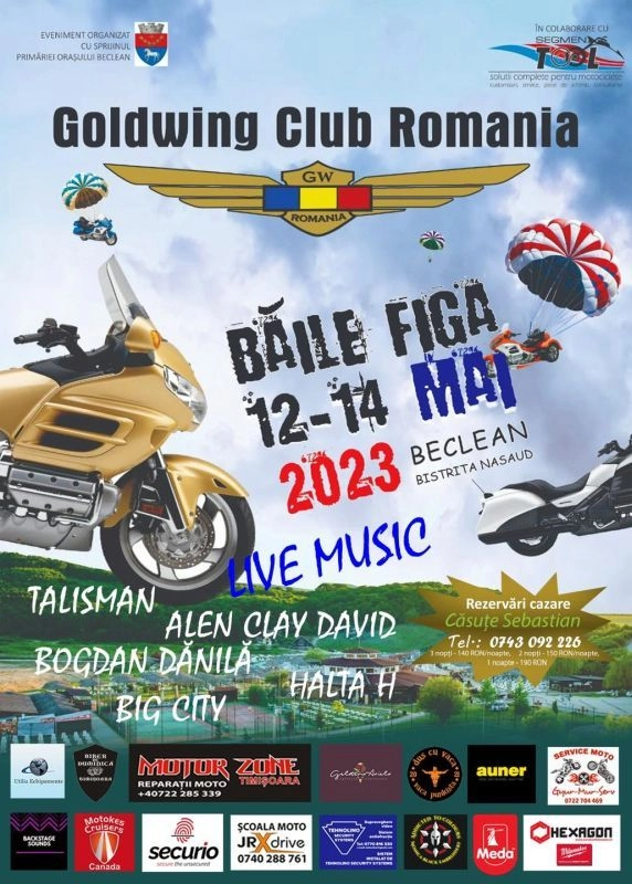 O întrunire moto organizată de Goldwing Club România și Primăria Orașului Beclean va avea loc în perioada 12-14 mai la Băile Figa.