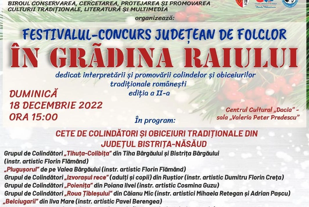 17.12.2022Festivalul concurs județean de folclor: "În grădina Raiului", la Centrul Cultural Dacia