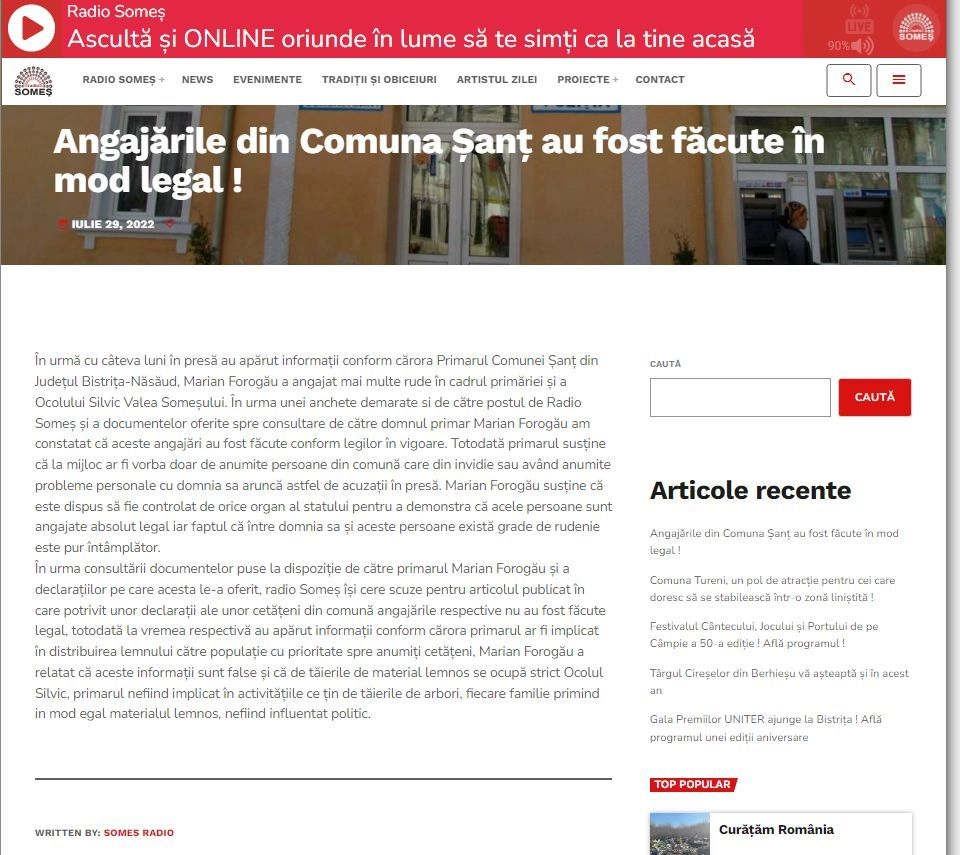Radio Someș a publicat un materiale fără precedent în presa locală. Postul de radio și-a cerut scuze primarului comunei Șanț, Marian Forogău, des...